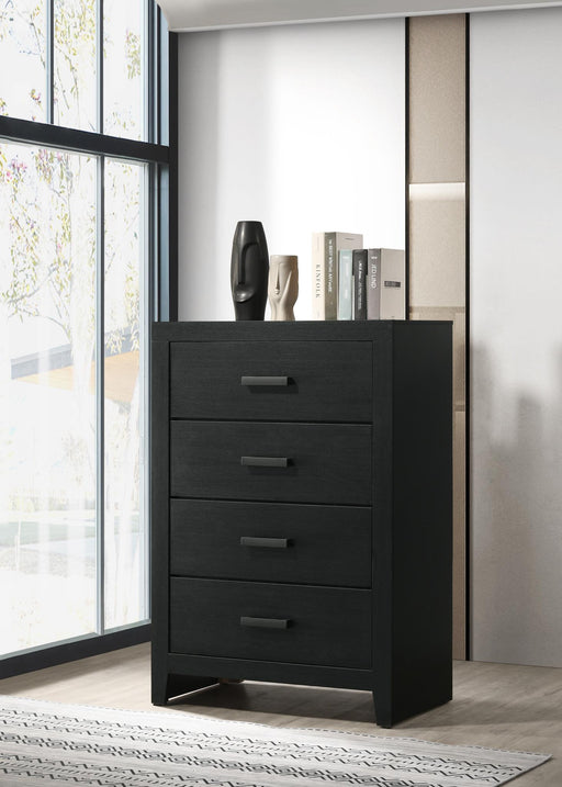 With its clean-lined look and modern attitude, this chest of drawers is a fresh style awakening. A warm charcoal hue over replicated oak grain easi...
