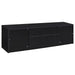 This sleek entertainment center combines a contemporary black finish with practical storage solutions. Made from durable engineered wood, it’s topped with a scratch-resistant eco-friendly laminate veneer. The unit includes two cabinets for concealed storage, an open shelf with a cable management hole for media devices, and a spacious drawer for organization. Its sturdy construction and modern silhouette make it a versatile piece for any entertainment setup.